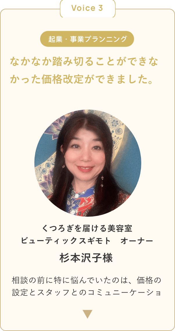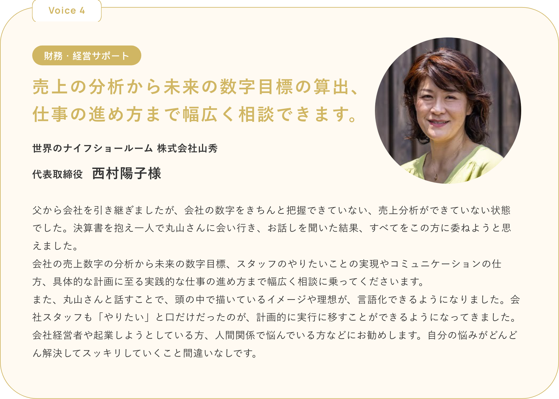起業家向けに一人ひとりの個性を活かした事業作りや価格設定、数字の読み方をアドバイスしており、お客様の価値観やペースを大切に考えたサポートに定評がある。近年は、中小企業向けに事業分析だけでなく、トヨタの問題解決手法を取り入れた効率的な仕事の進め方などを助言し、働き方改革をしながら業績を上げたい経営者からも高い評価を得ている。独立前、異業者交流会などで、好きなことを仕事にしたにも関わらず、低価格で悩んでいる方々からの相談が多く、起業や副業のハードルが下がった現在において、価格と価値のバランスやビジネスの基本である数字の捉え方を伝える必要性を痛感。
